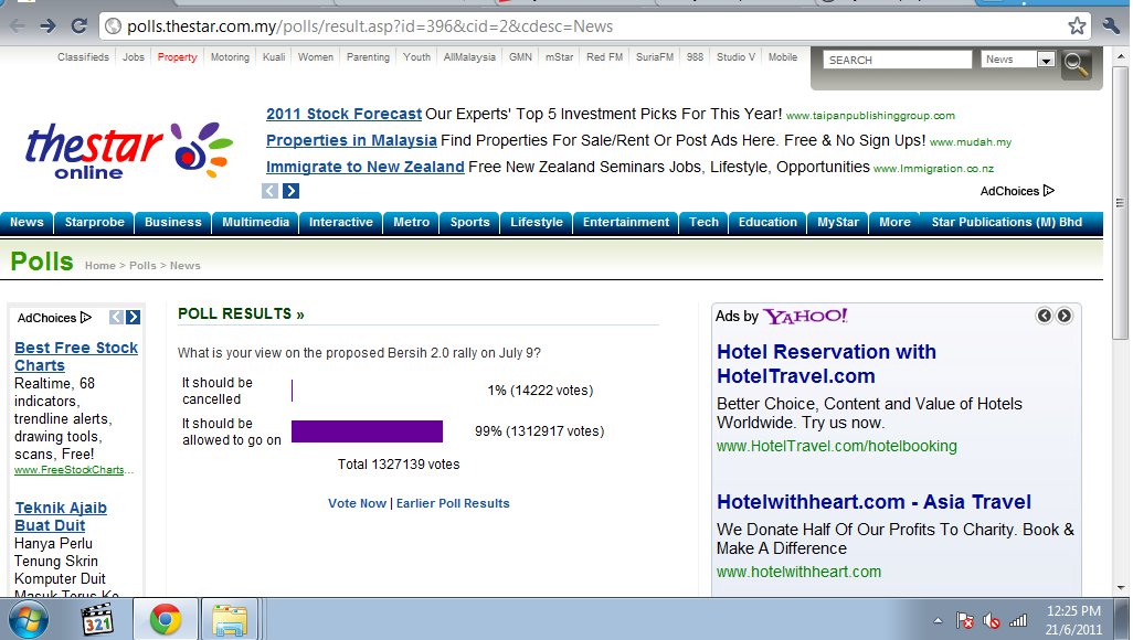 KUALA LUMPUR, 21 JUN – Mengikut kaji selidik oleh The Star Online, lebih 1.3 juta rakyat Malaysia mahu perhimpunan Bersih pada 9 Julai depan diteruskan.