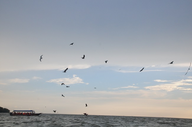 Kami bersama Ng menaiki sebuah bot berkapasiti 24 orang dari Tanjong Karang menuju ke destinasi yang mengambil masa lebih kurang 45 minit. Sesampainya saja di tempat habitat, pemandu bot terus mencampakkan lemak dan kulit ayam, secara merta entah dari mana muncul sekumpulan helang menerkam ke arah bot kami (tempat makanan dicampakkan). Jarak paling dekat antara helang dan bot kami adalah 30 meter. Menurut Ng, ada tiga jenis helang di sini helang cokelat berkepala putih (Winston), helang besar berwarna putih dan helang cokelat. Kami dapat melihat sendiri binatang yang hanya dapat dilihat dalam buku teks sekolah rendah dulu iaitu bangau putih dan burung camar.