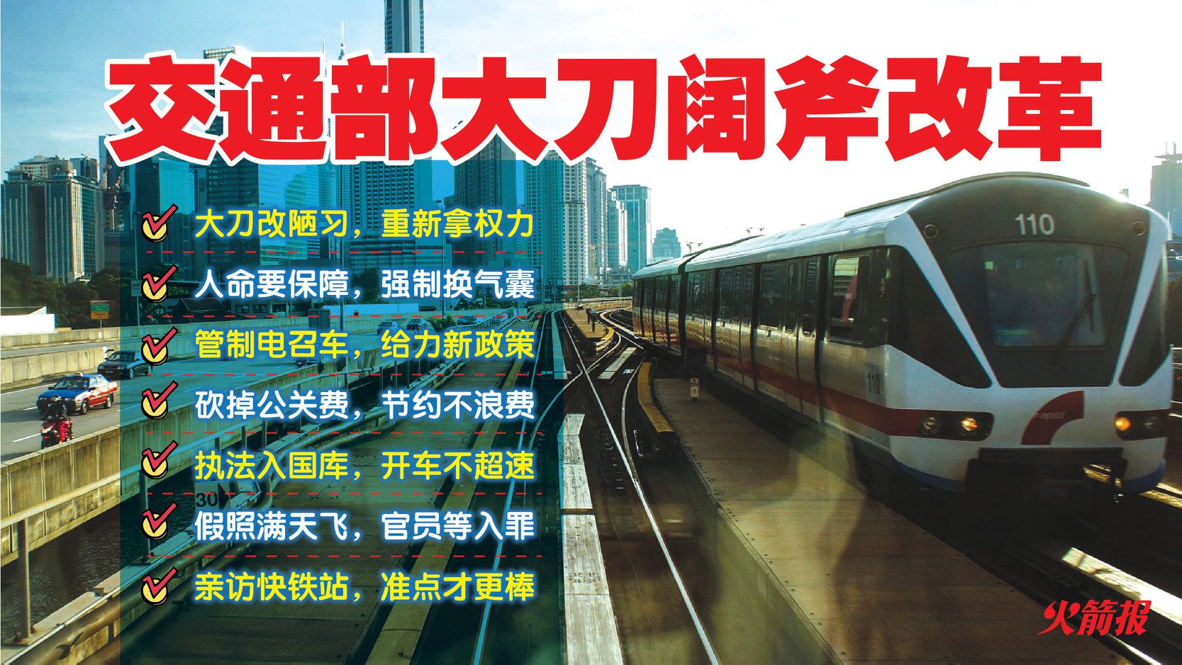 《火箭报》就为大家列出交通部的改革目标,我们每天走出门就需要用到各种交通工具,无论你是自己开车要关注道路安全、搭乘公共交通工具的方便度和准时度、都是与大家有着非常贴身的关系,我们期望交通部能够尽快落实各项改革,还人民一个安全、方便、又舒适的交通空间。