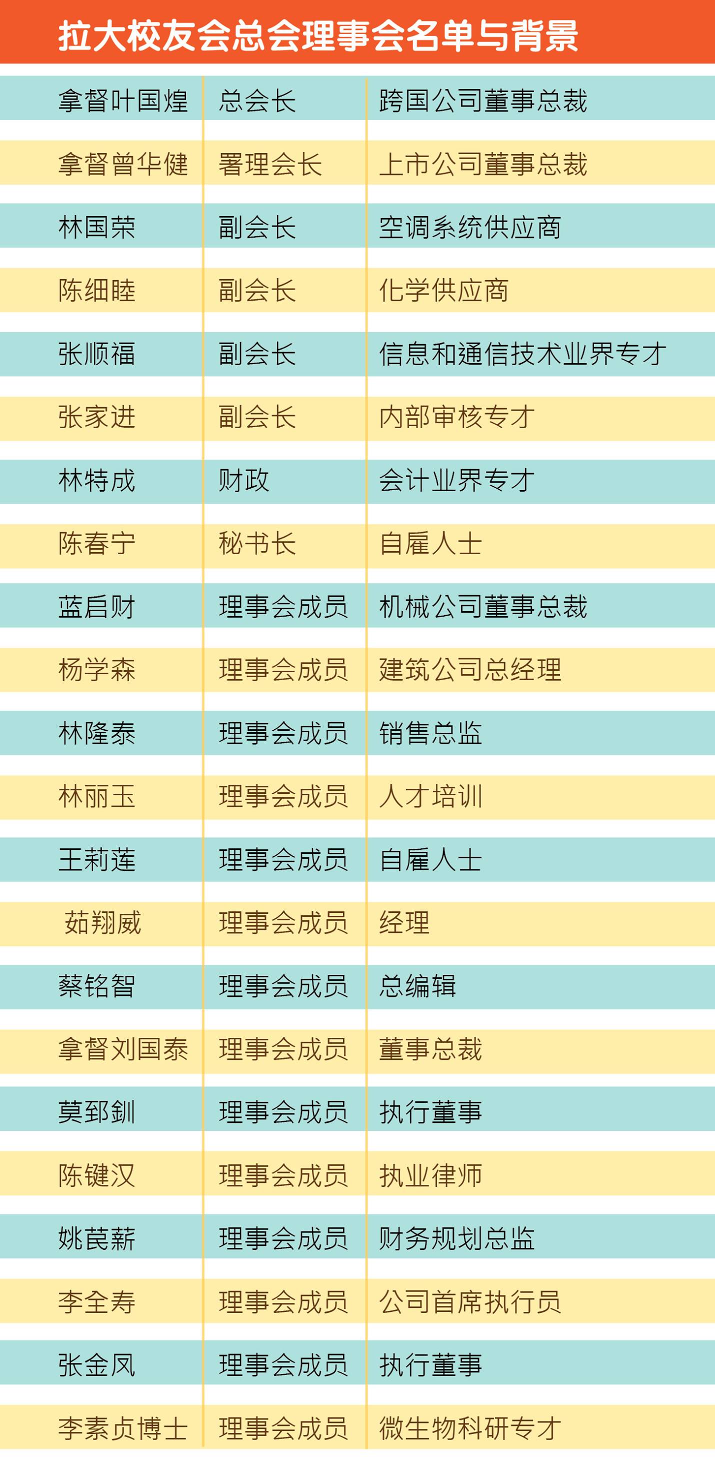 自拉曼大学学院校友会总会表态支持政党与高等教育脱钩后,昨晚又有一批拥有专业背景的杰出校友加入联署,表明支持政教分家,这些代表包括:拿督苏添来(业界咨询与合作)、杨征陆(业界咨询与合作)、拿督冯家财(业界咨询与合作)、拿督苏启志(业界咨询和合作)、拿督黄美锦博士(法律)、余永平(稽查)、廖添来(稽查)、蔡冰勇博士(教育)、拿督邱进元(税务)等等,都是在各自领域独当一面的专家,再加上校友会总会的理事(见附表),相信这批专业人士必定有能力带领拉大迈向新的里程碑。