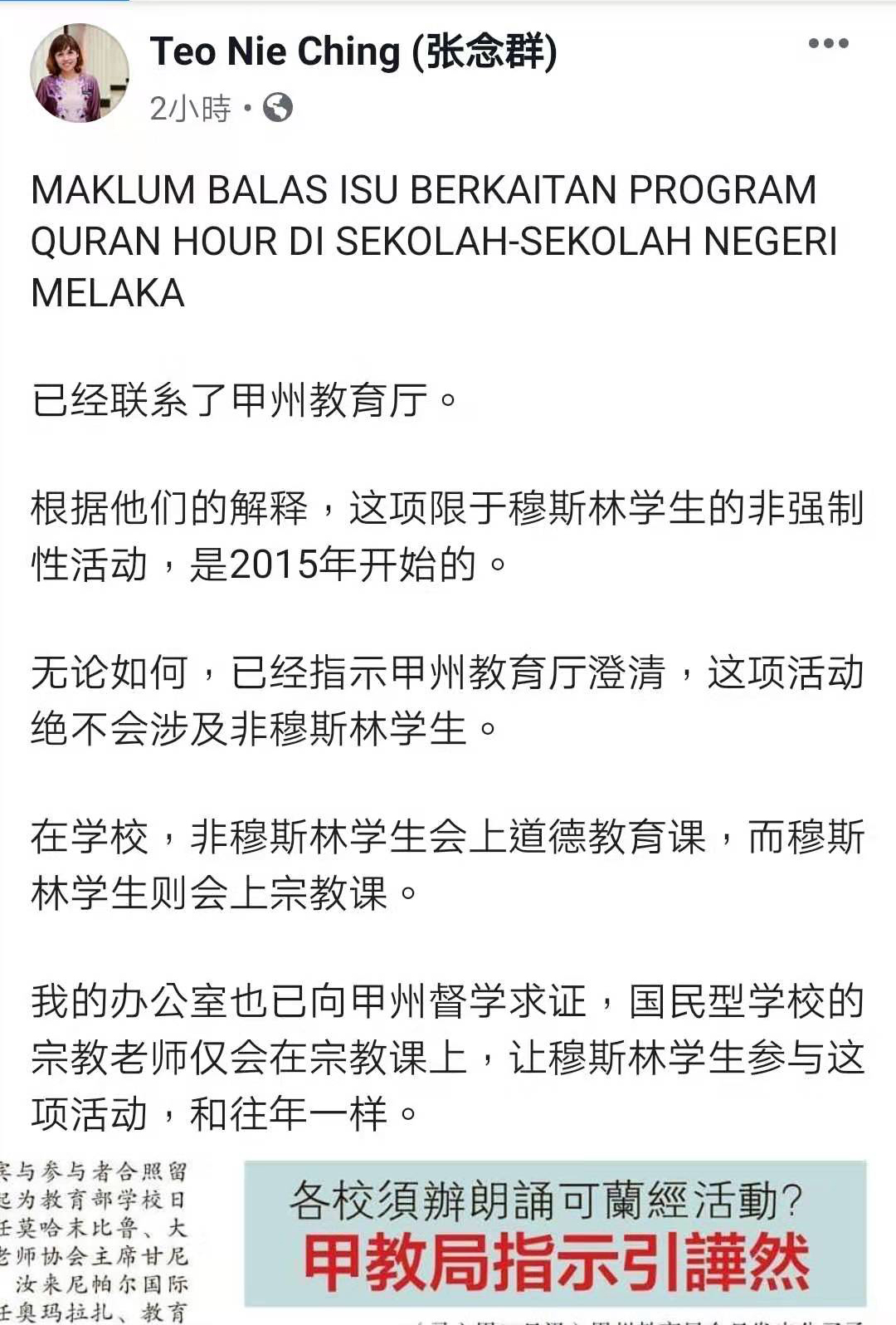 而在国民型学校中,非穆斯林学生都会上道德教育课,而穆斯林学生则会上宗教课。所以教育部也向甲州督学求证,确定国民型学校的宗教老师只会在宗教课上让穆斯林学生参与这项活动,就和往年一样而已。也就是说,这项活动的主要对象为信奉伊斯兰的学生,非穆斯林学生当然是无需参加的。