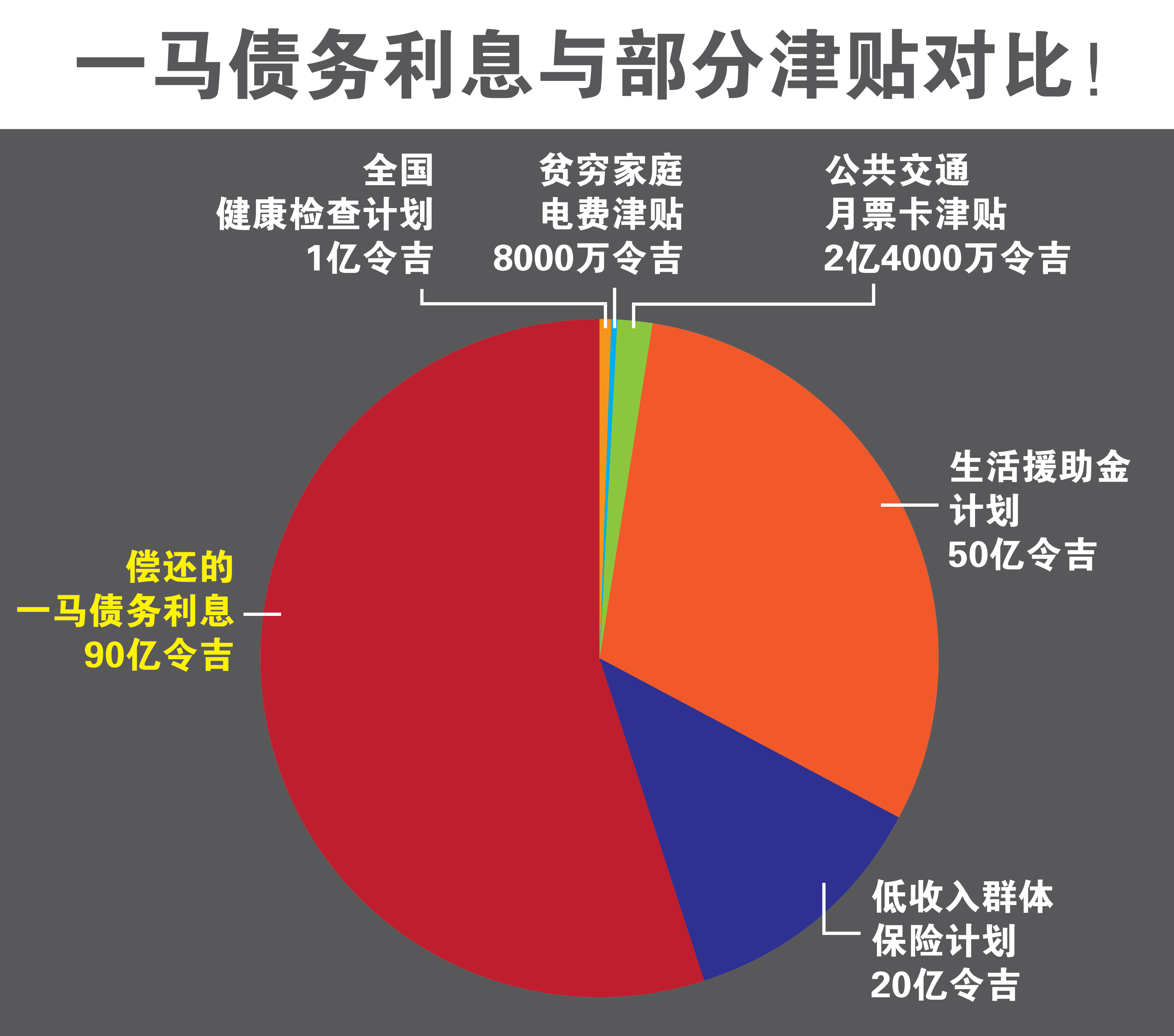 从以上的图表可以看到,即使是涉及全国许多人的生活援助金(BSH),都算是耗了政府一大笔资金来津贴这笔花费,但是跟一马公司债务的利息相比起来,却依然有很大差异。生活援助金耗资只有50亿左右,但是一马的债务利息就已经超过了它的40亿而达到90亿令吉!