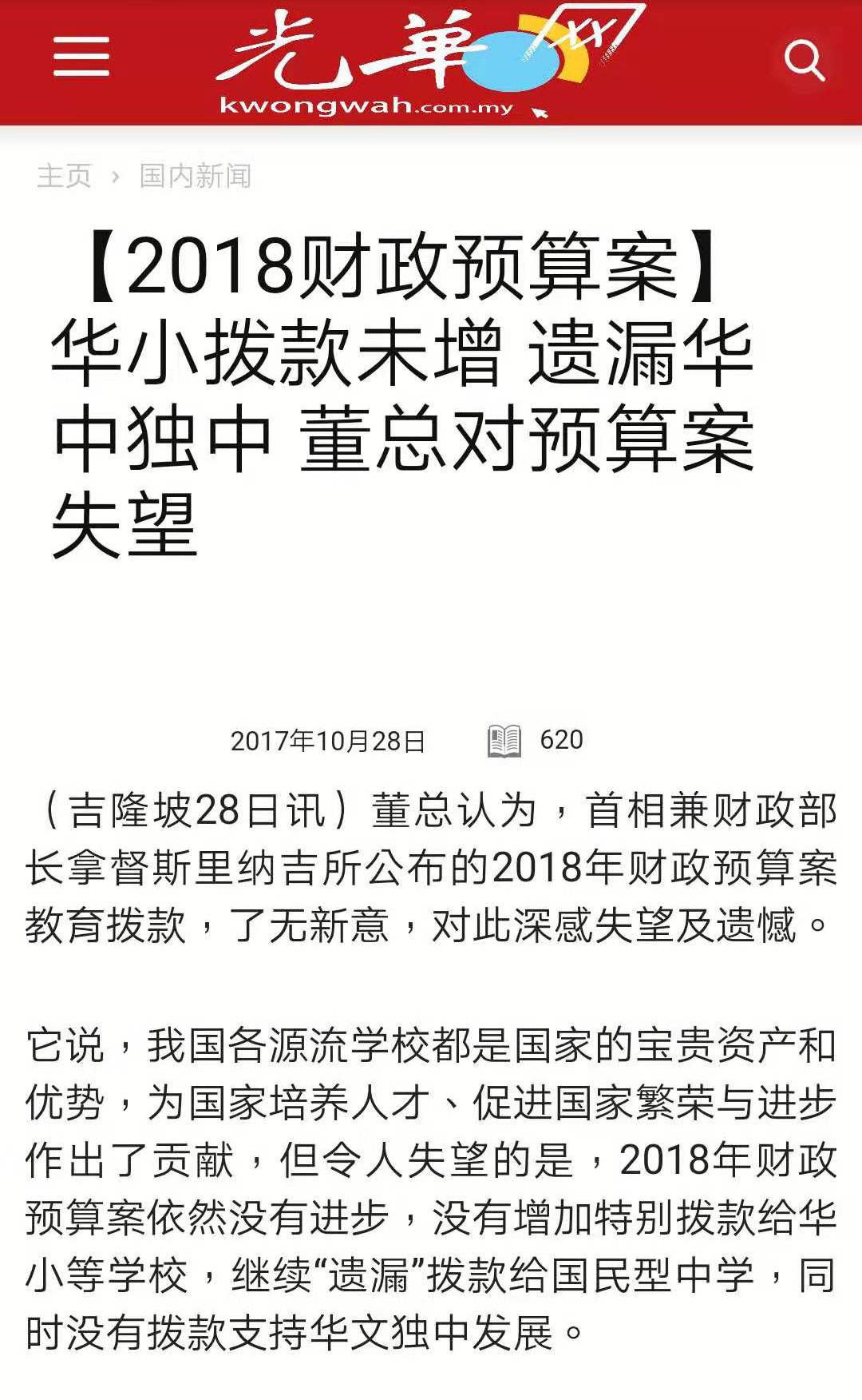 例如在图片中显示的2018年华中拨款有1500万,事实是在2018年预算案,华中根本没有拨款1500万。当时董总也针对这件事情发出文告,并表示“2018财政预算案,华小拨款未增,并且遗漏华中独中,对预算案失望”。