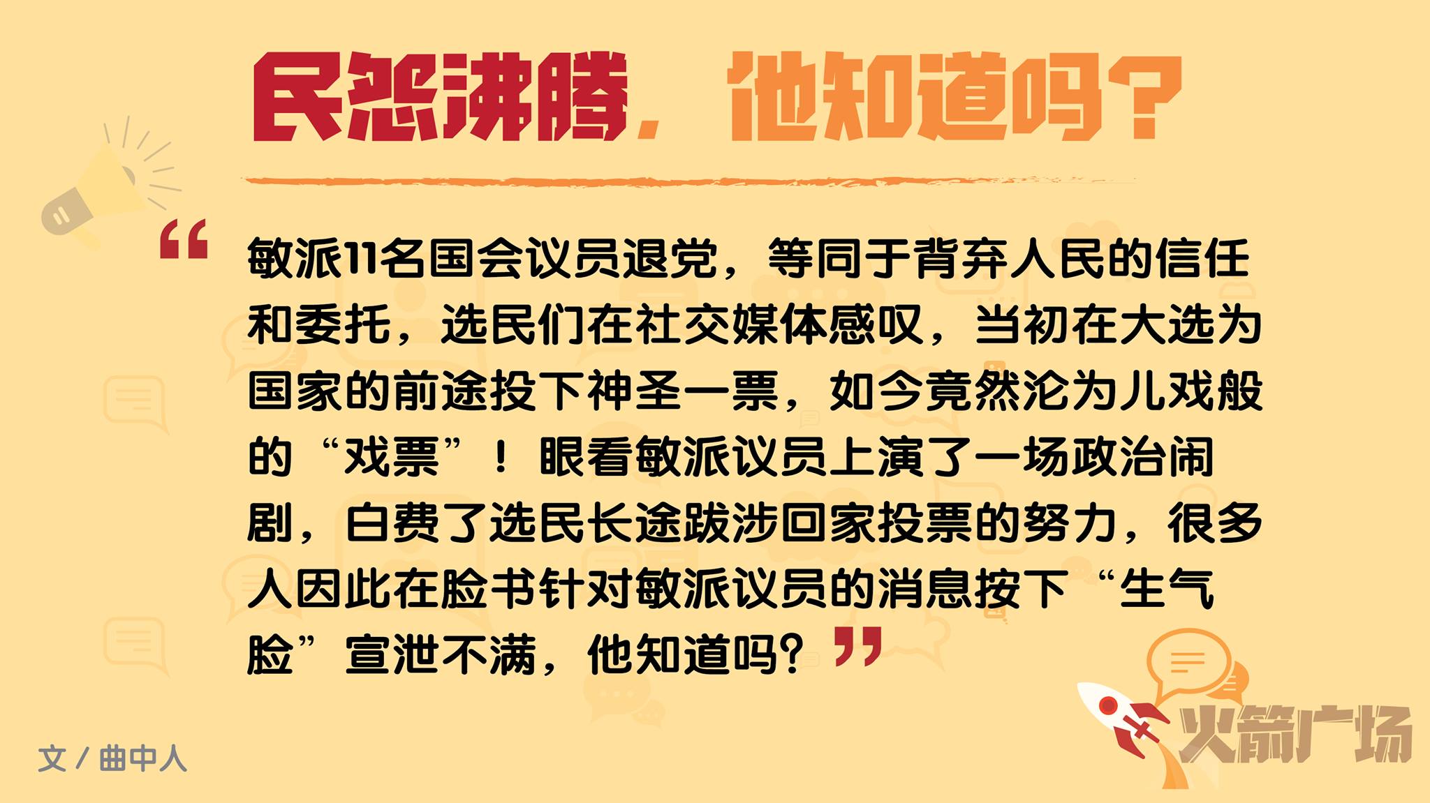 敏派11名国会议员退党,等同于背弃人民的信任和委托,选民们在社交媒体感叹,当初在大选为国家的前途投下神圣一票,如今竟然沦为儿戏般的“戏票”!眼看敏派议员上演了一场政治闹剧,白费了选民长途跋涉回家投票的努力,很多人因此在脸书针对敏派议员的消息按下“生气脸”宣泄不满,他知道吗?