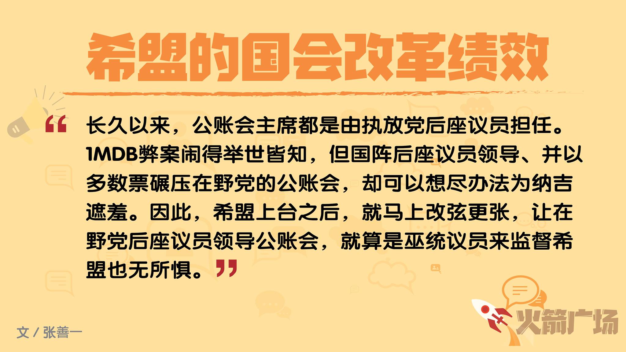 长久以来,公账会主席都是由执放党后座议员担任。1MDB弊案闹得举世皆知,但国阵后座议员领导、并以多数票碾压在野党的公账会,却可以想尽办法为纳吉遮羞。因此,希盟上台之后,就马上改弦更张,让在野党后座议员领导公账会,就算是巫统议员来监督希盟也无所惧,就这份改革勇气而言,我们也应该为希盟记上一功。