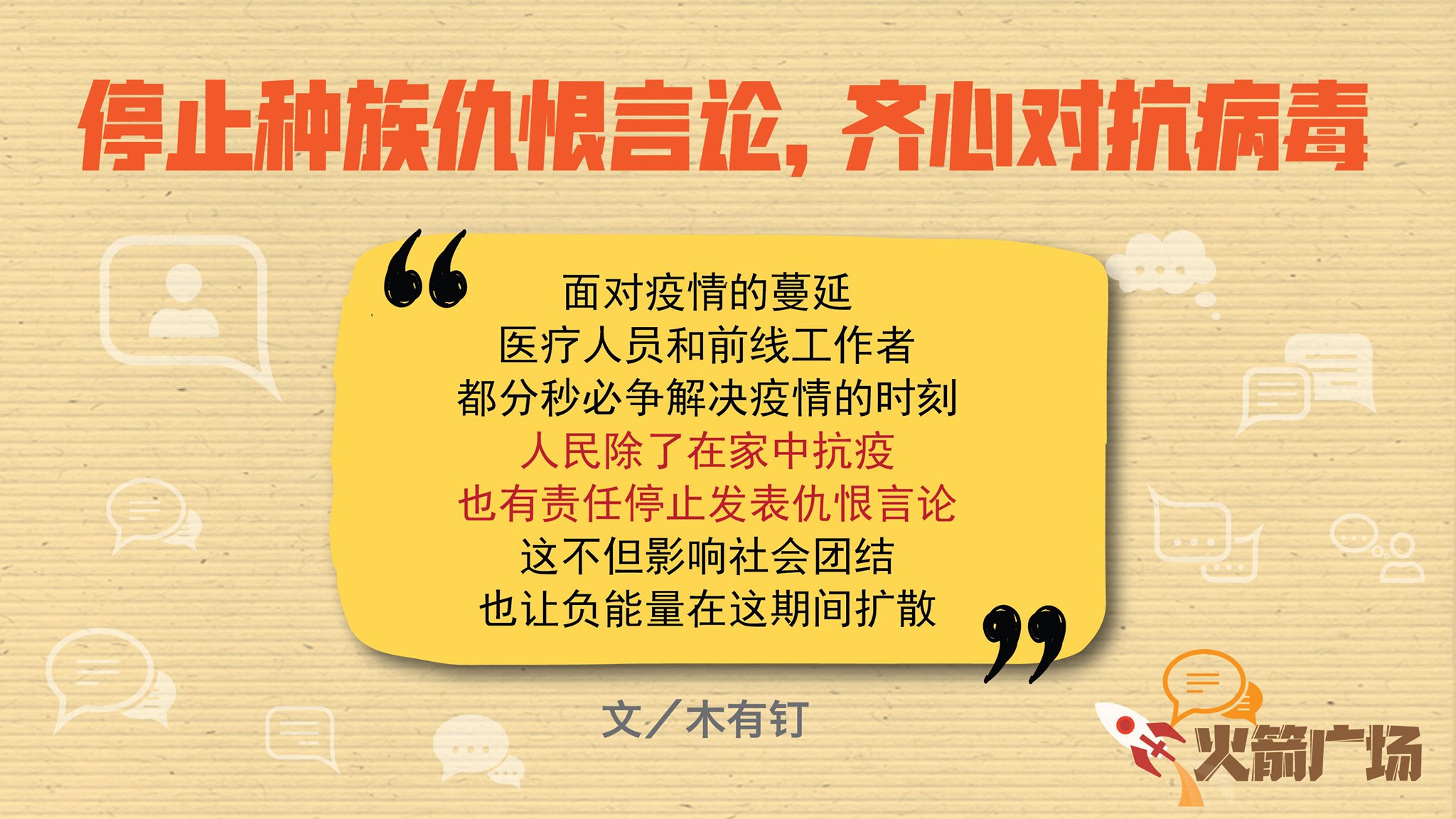 面对疫情的蔓延,医疗人员和前线工作者都分秒必争解决疫情的时刻,人民除了在家中抗疫也有责任停止发表仇恨言论,这不但影响社会团结,也让负能量在这期间扩散。