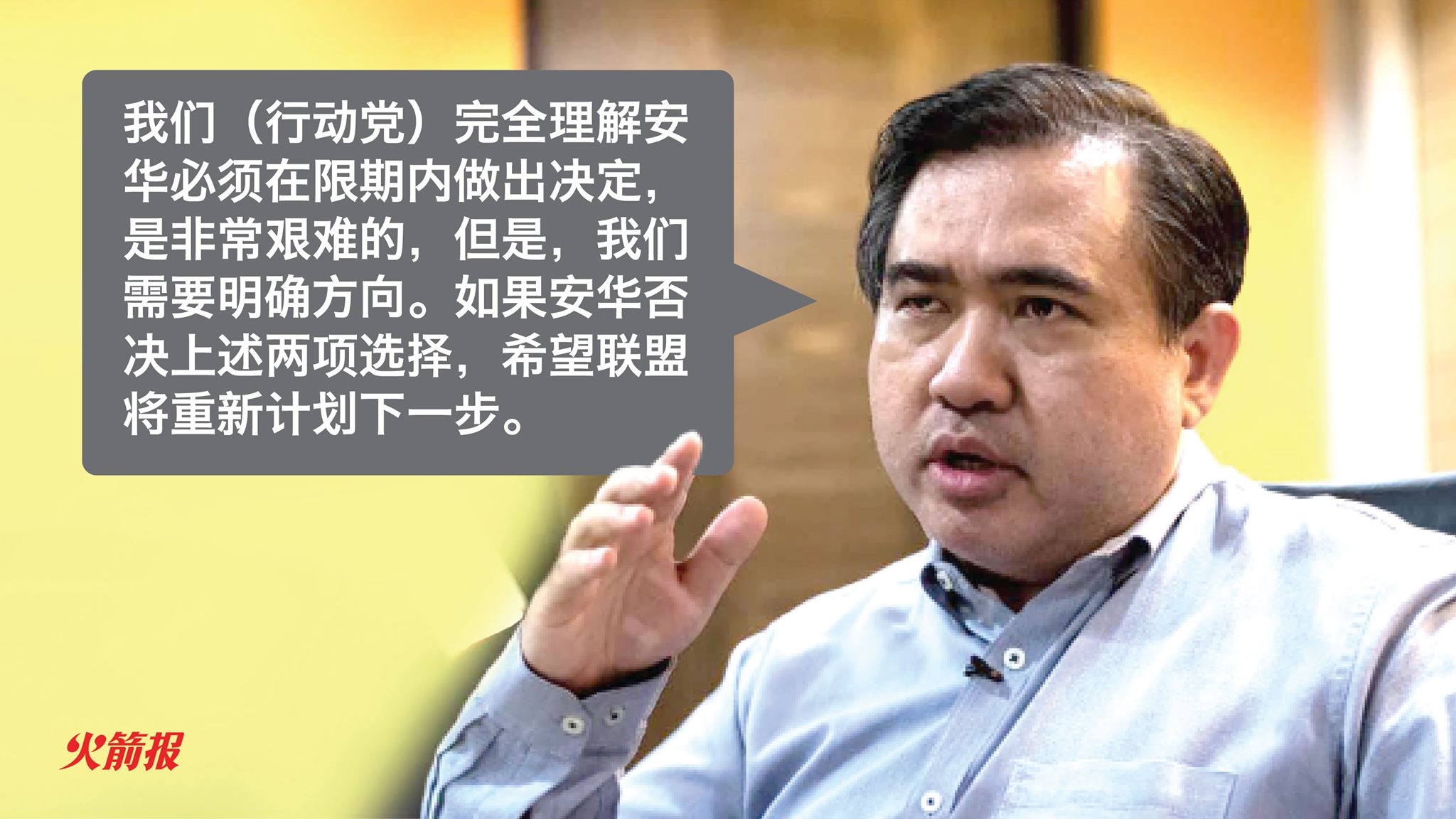 “我们(行动党)完全理解安华必须做出艰难的决定,但是,我们需要明确方向。如果安华否决上述两项选择,希望联盟将重新计划下一步。”