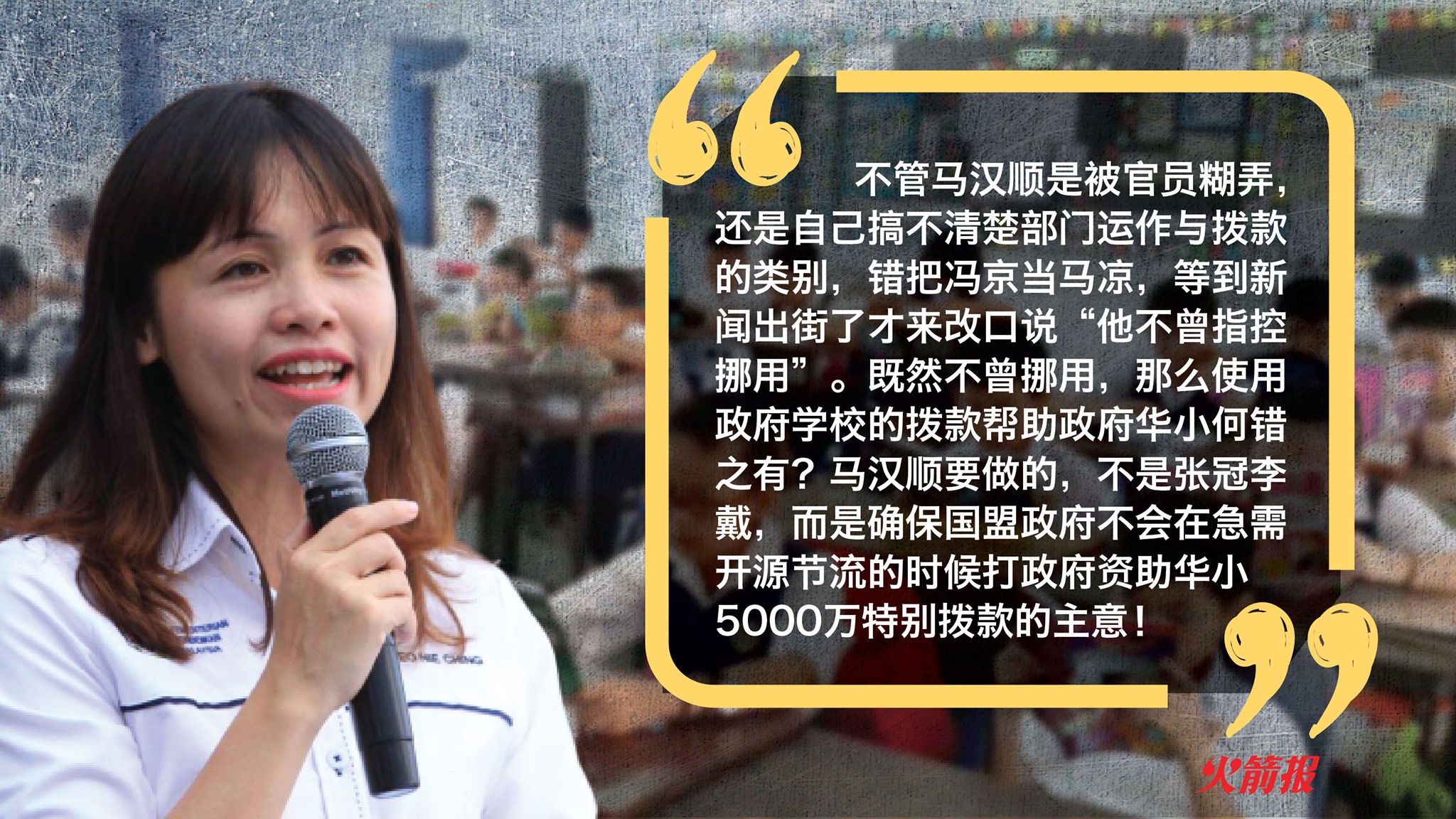 不管马汉顺是被官员糊弄,还是自己搞不清楚部门运作与拨款的类别,错把冯京当马凉,等到新闻出街了才来改口说“他不曾指控挪用”。既然不曾挪用,那么使用政府学校的拨款帮助政府华小何错之有?马汉顺要做的,不是张冠李戴,而是确保国盟政府不会在急需开源节流的时候打政府资助华小5000万特别拨款的主意!
