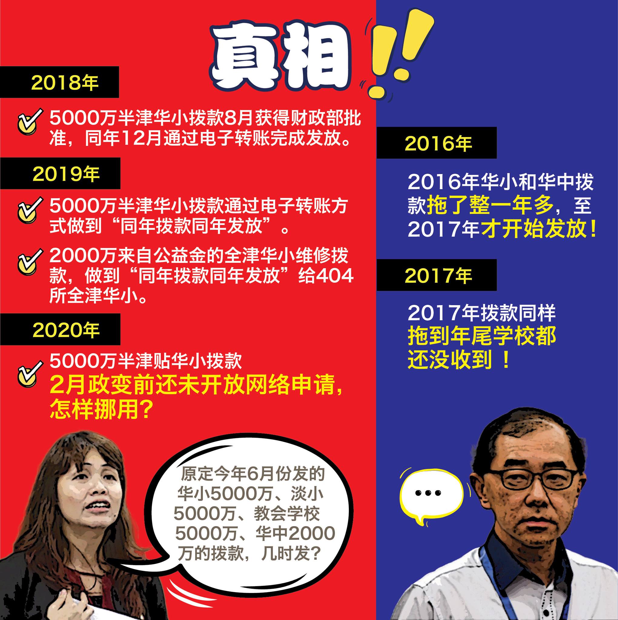 华小5000万特别拨款是给予政府资助华小董事部的拨款。打自国阵时期,除了政府资助华小可以在这笔拨款下受惠,隶属于政府学校的华小有时也可以获得“政府学校”的维修拨款,可是这笔拨款并非直接下放给董事部,而是交给州教育厅或是县教育局,一切维修工程也由州教育厅或县教育局主导。