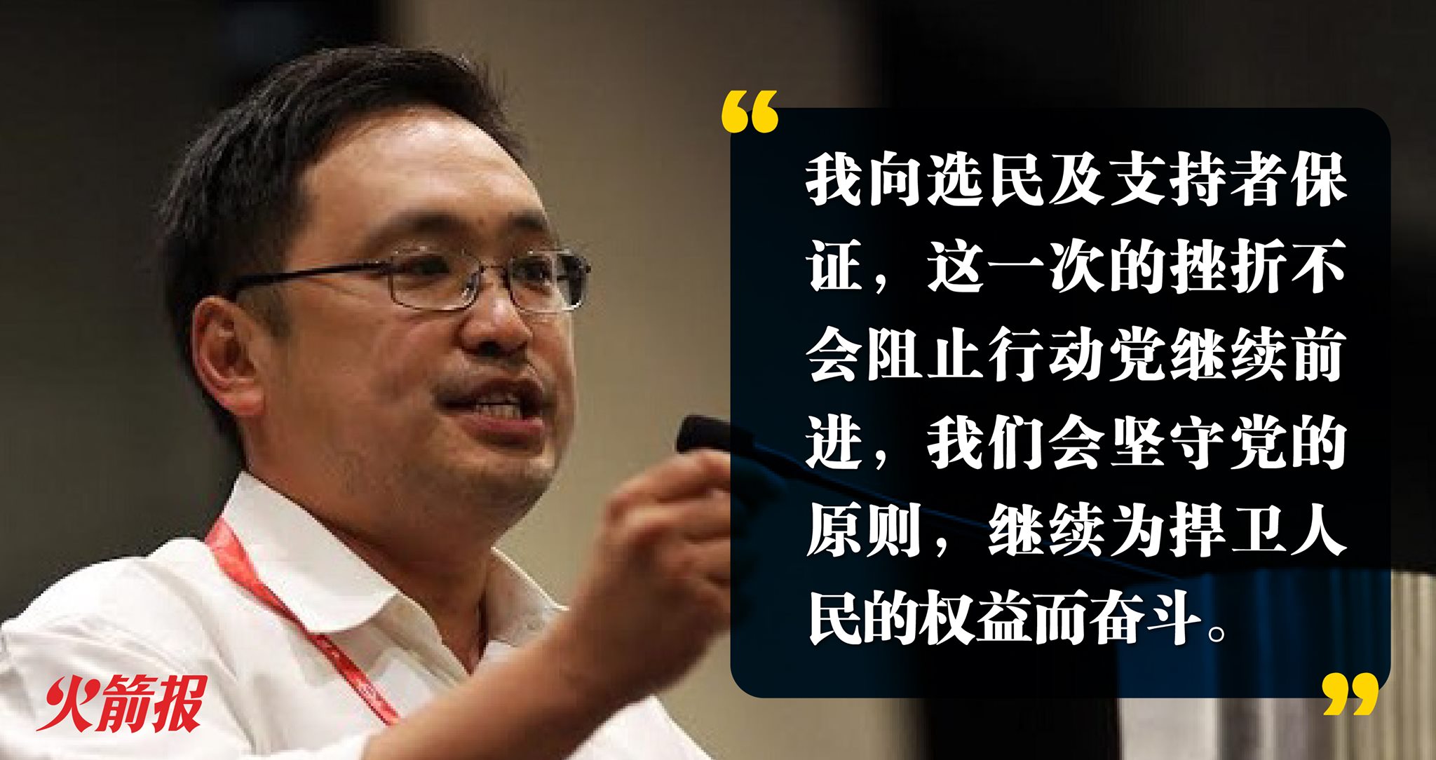对于浮罗岸的选民和行动党支持者,我谨代表行动党向大家说声抱歉,让黄庆伟在浮罗岸区代表行动党,是我们信错人了,更是所托非人。在此我向选民及支持者保证,这一次的挫折不会阻止行动党继续前进,我们会坚守党的原则,继续为捍卫人民的权益而奋斗。