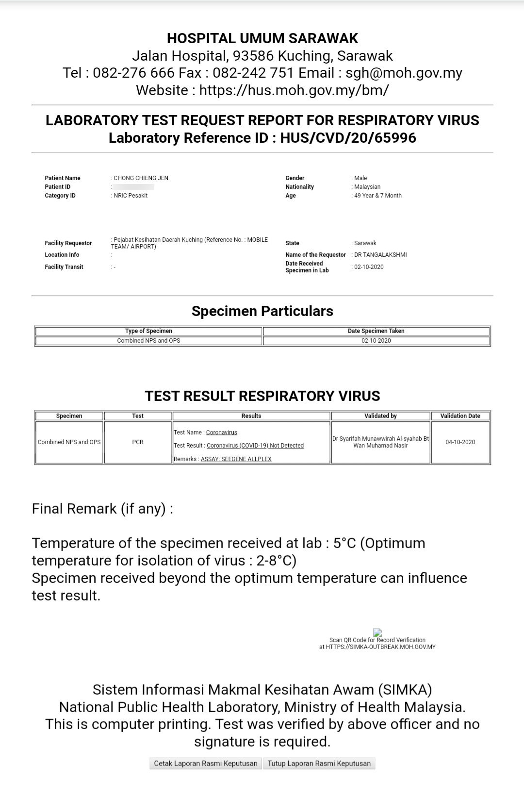 我于10月2日从吉隆坡返回古晋后进行检测。以下为由砂卫生局发出的检测报告,我是呈阴性反应。