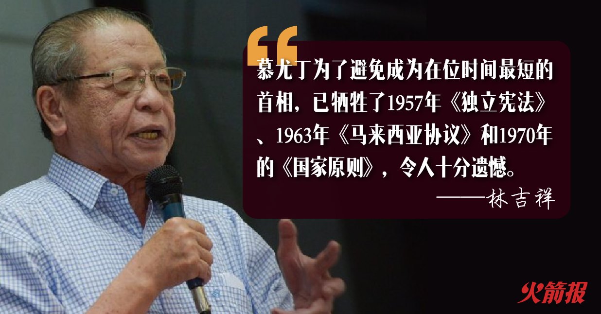 丹斯里慕尤丁为了继续担任马来西亚的第八任首相,避免成为在位时间最短的首相已牺牲了1957年《独立宪法》、1963年《马来西亚协议》和1970年的《国家原则》,令人十分遗憾。
