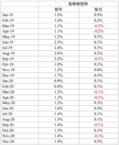 在着眼于2020年消费者物价指数全年下跌1.2%的同时,我们也必须按类别进行分析及按月进行比较。令人担忧的是,12月的消费者物价指数按年下跌1.4%,而比起2020年11月则按月增长0.5%。