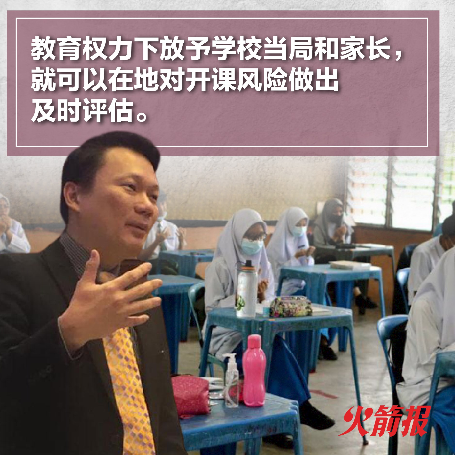 他指出,既然政府能够下放权限予市长、地方政府首长和19级以上的地方政府执法官员,以向违反1988年传染病预防和控制法令者开罚单,那么下放教育权力给学校和家长,更不应该是一个问题。他呼吁政府应该先知先觉,以主动迅速的决策取代被动缓慢的应对,更不要等到局面失控才后知后觉。