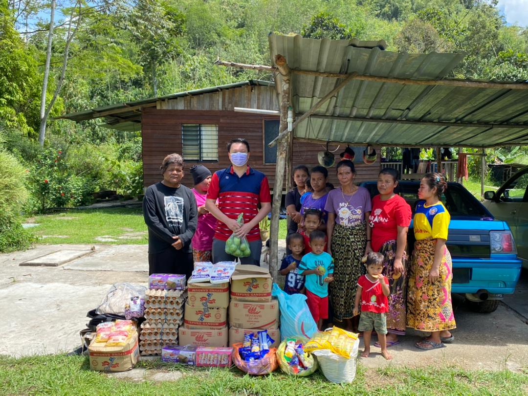 图:张玉刚(左2)派发救济品给Kampung Cheros的原住民