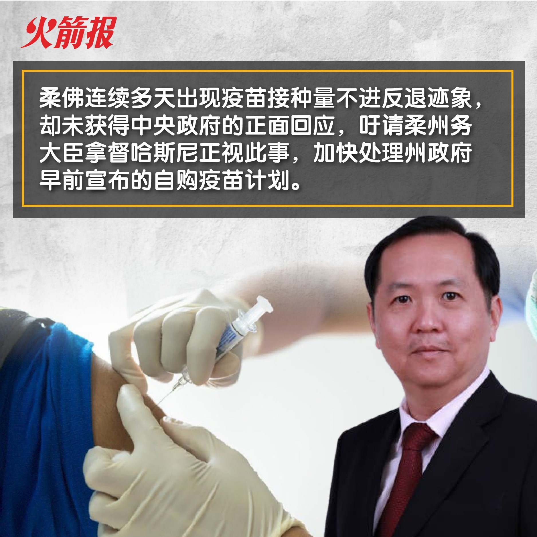 1. 柔佛连续多天出现疫苗接种量不进反退迹象,却未获得中央政府的正面回应,我吁请柔州务大臣拿督哈斯尼正视此事,加快处理州政府早前宣布的自购疫苗计划,同时交代进展,以期柔州子民能在短期内获得接种。