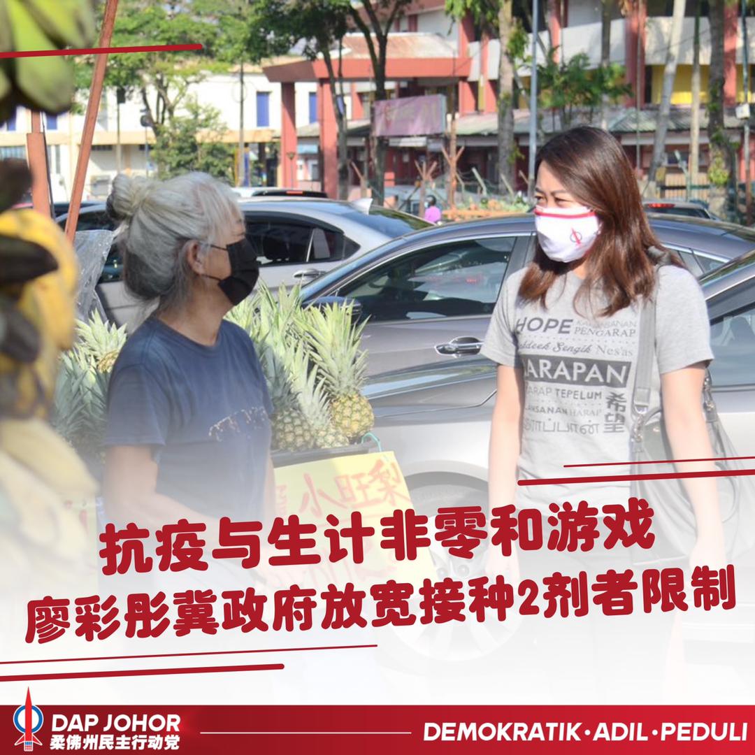 廖彩彤强调,政府在疫苗接种的工作上失去先机,过去一个星期以来,全国疫苗接种效率才终于逐渐增长。随着疫苗供给逐渐充足,国家复苏理事会应该考虑放宽限制,让已接种两剂疫苗者做为带动经济复苏的领头羊因为他们属于较低风险群体。与其一味的给予援助、人民更需要的是开放经济领域、制造就业机会、以恢复正常生活运作。在复苏国内经济活动之余,也可以进一步鼓励那些还对接种疫苗迟疑不决的国民。