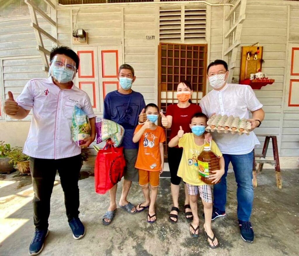 倪可敏亲自移交希望福袋及米糧于安顺低收入家庭以协助减轻他们的生活负担。左为吴家良。