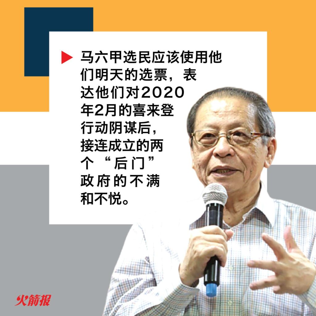 马六甲选民应该使用他们明天的选票来表达他们对2020年2月的喜来登行动阴谋后接连成立的两个“后门”政府的不满和不悦,这个阴谋推翻了只上台执政22个月的希望联盟政府,而之后的“后门”政府的表现都不达标准。