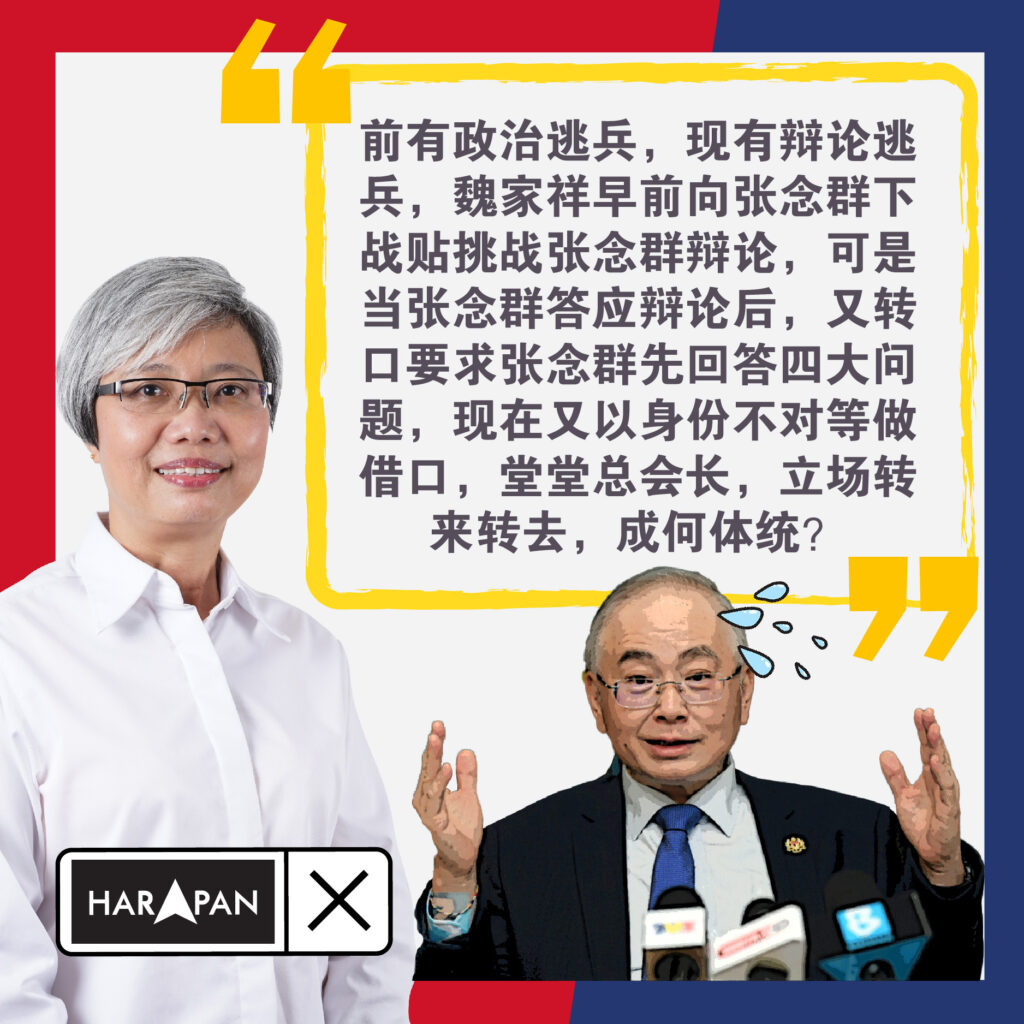 “前有政治逃兵,现有辩论逃兵,魏家祥早前向张念群下战贴挑战张念群辩论,可是当张念群答应辩论后,又转口要求张念群先回答四大问题,现在又以身份不对等做借口,堂堂总会长,立场转来转去,成何体统?