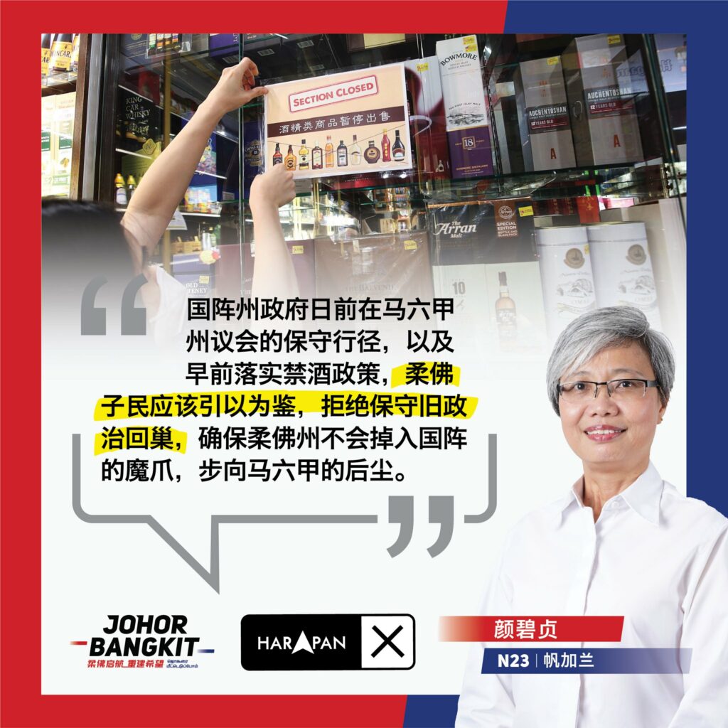 民主行动党帆加兰区候选人颜碧贞表示,国阵州政府日前在马六甲州议会的保守行径,以及早前落实禁酒政策,柔佛子民应该引以为鉴,拒绝保守旧政治回巢,确保柔佛州不会掉入国阵的魔爪,步向马六甲的后尘。
