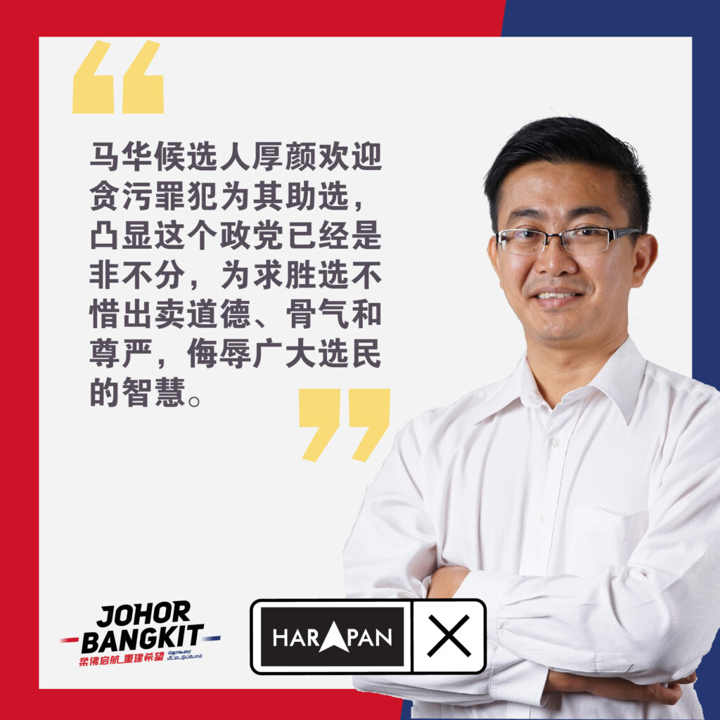 杨敦祥感叹,马华候选人厚颜欢迎贪污罪犯为其助选,凸显这个政党已经是非不分,为求胜选不惜出卖道德、骨气和尊严,侮辱广大选民的智慧。