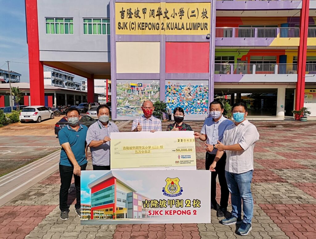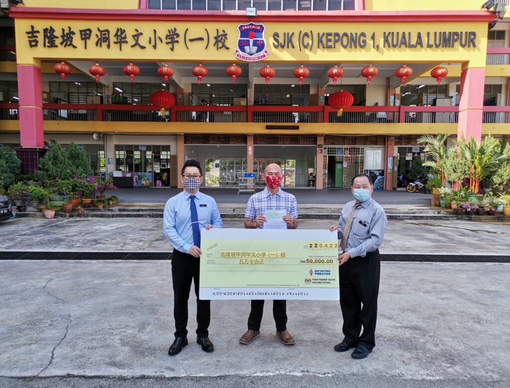 “昨天,我在该两间学校,移交了各5万令吉的支票于甲洞华文小学一校校长魏官云先生和二校校长钱秀芬女士。