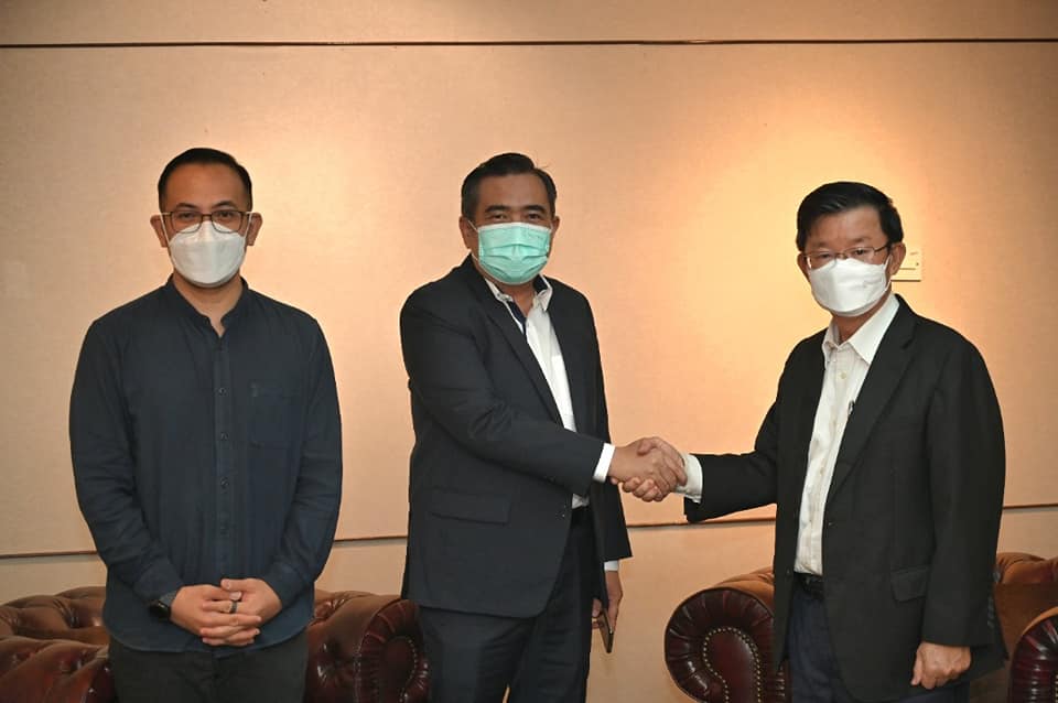 陆兆福(中)拜访槟州首长曹观友(右),由大山脚区国会议员沈志强陪同。