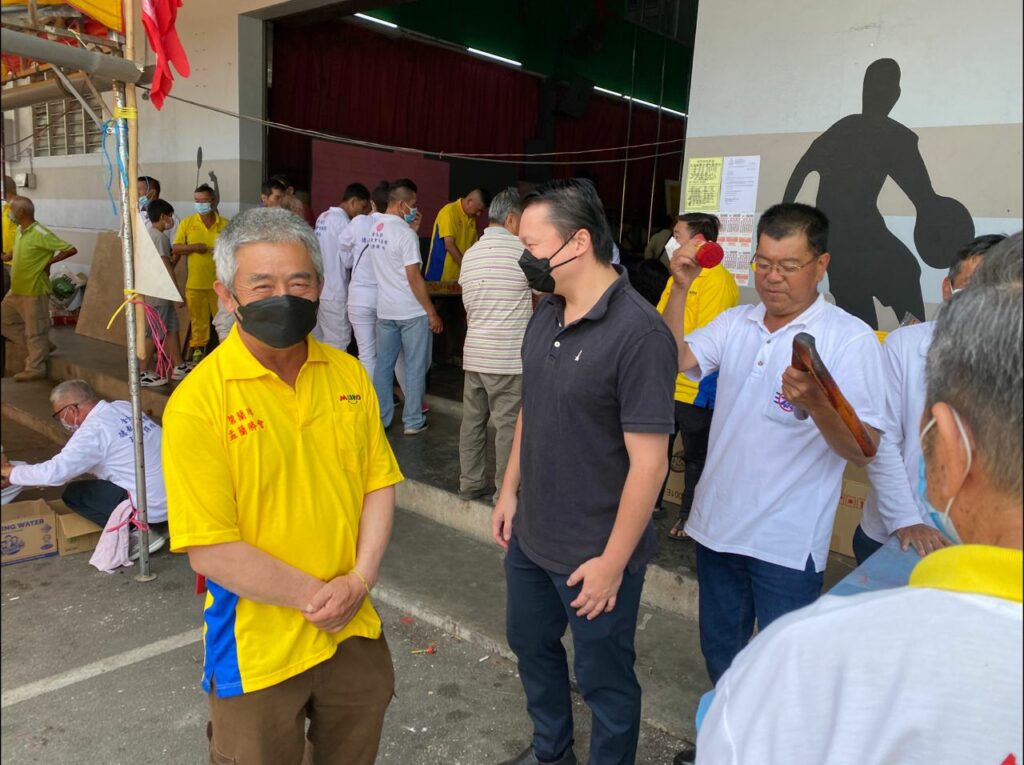 图说:张玉刚(中)和金马仑碧兰璋新镇行动党副主席蔡文全(左)出席碧兰璋盂兰胜会拜祭仪式,共求全境风调雨顺,五谷丰收和国泰民安。