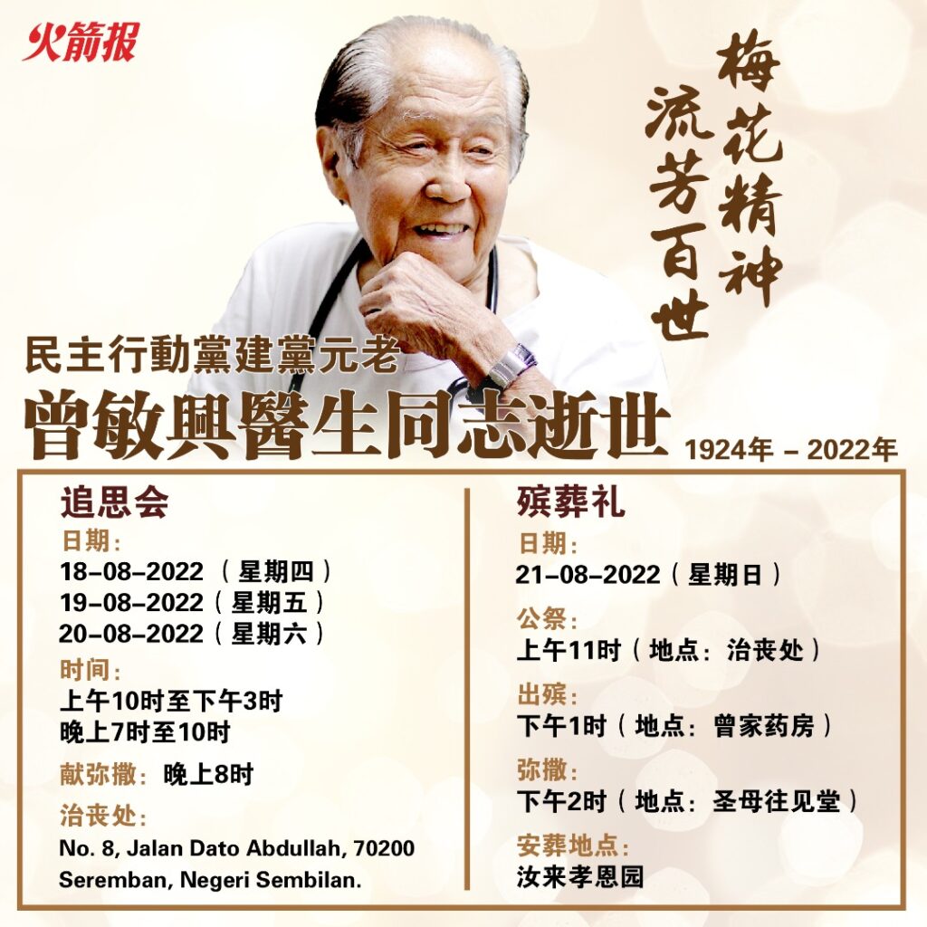 民主行动党建党元老曾敏兴医生同志于2022年8月17日与世长辞,享年98岁。