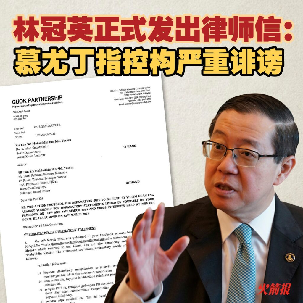 民主行动党主席林冠英今天正式向前首相慕尤丁发出律师信,要求慕尤丁撤回诽谤言论、道歉及赔偿。