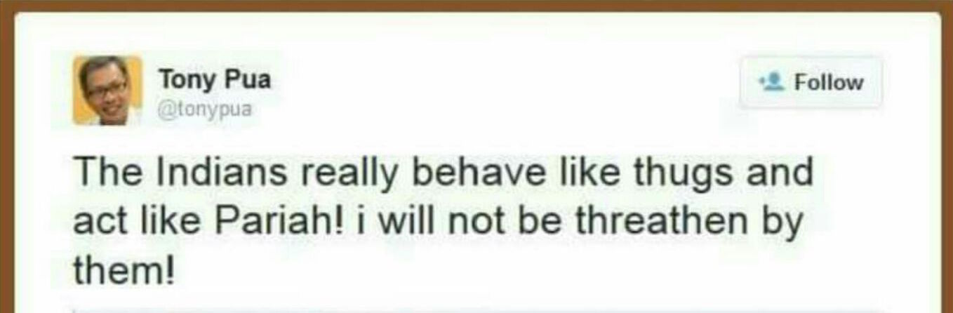 根据有关讯息内容,据称我在推文中表示:“印度人真的像流珉和行动像‘賎民’(Pariah)!我将不会被他们威胁到!“