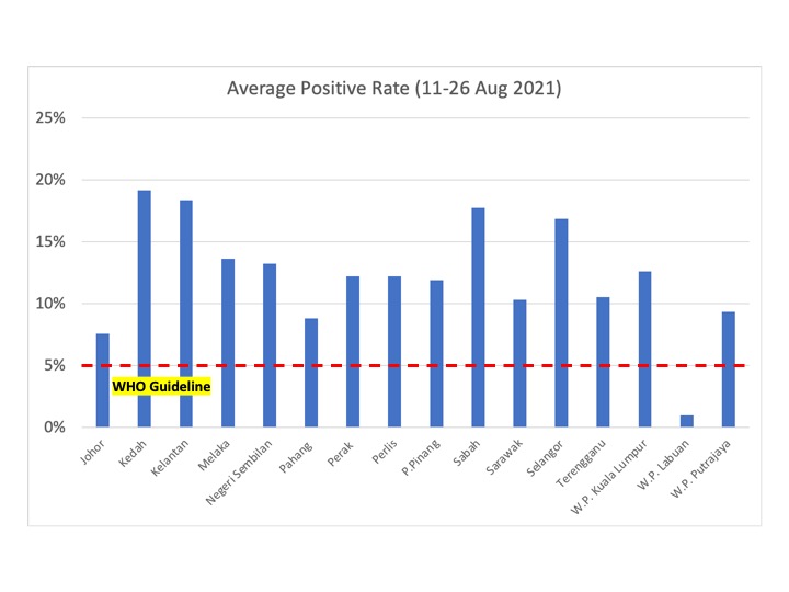 最近,卫生部终于公布了各州属更仔细的检测数字。图一显示不同州属从2021 年 8 月 11 日至 26 日的平均阳性率。这清楚地表明,除了纳闽,其他所有州属的阳性率都在 5% 以上,超过10 个州属的阳性率在 10%以上,其中 4 个州属 ——吉打、吉兰丹、沙巴和雪兰莪的阳性率更是在 15% 以上。