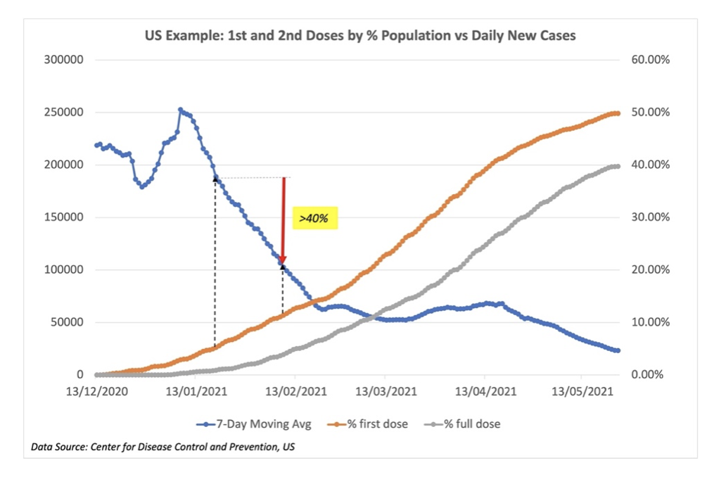 疫苗接种进度缓慢的代价是什么?或许我们可以通过美国疫苗接种计划的案例了解疫苗接种与每日新增确诊的人数之间的关系(美国首剂和次剂疫苗的分配比例跟我国相似)。观察结果是,相比起目前的接种进度 (5.4%和3%人口分别接种首剂和次剂疫苗),倘若我们可以达到所预测的接种目标(即12%和7%人口分别接种首剂和次剂疫苗),我们将能够减少40%确诊人数。