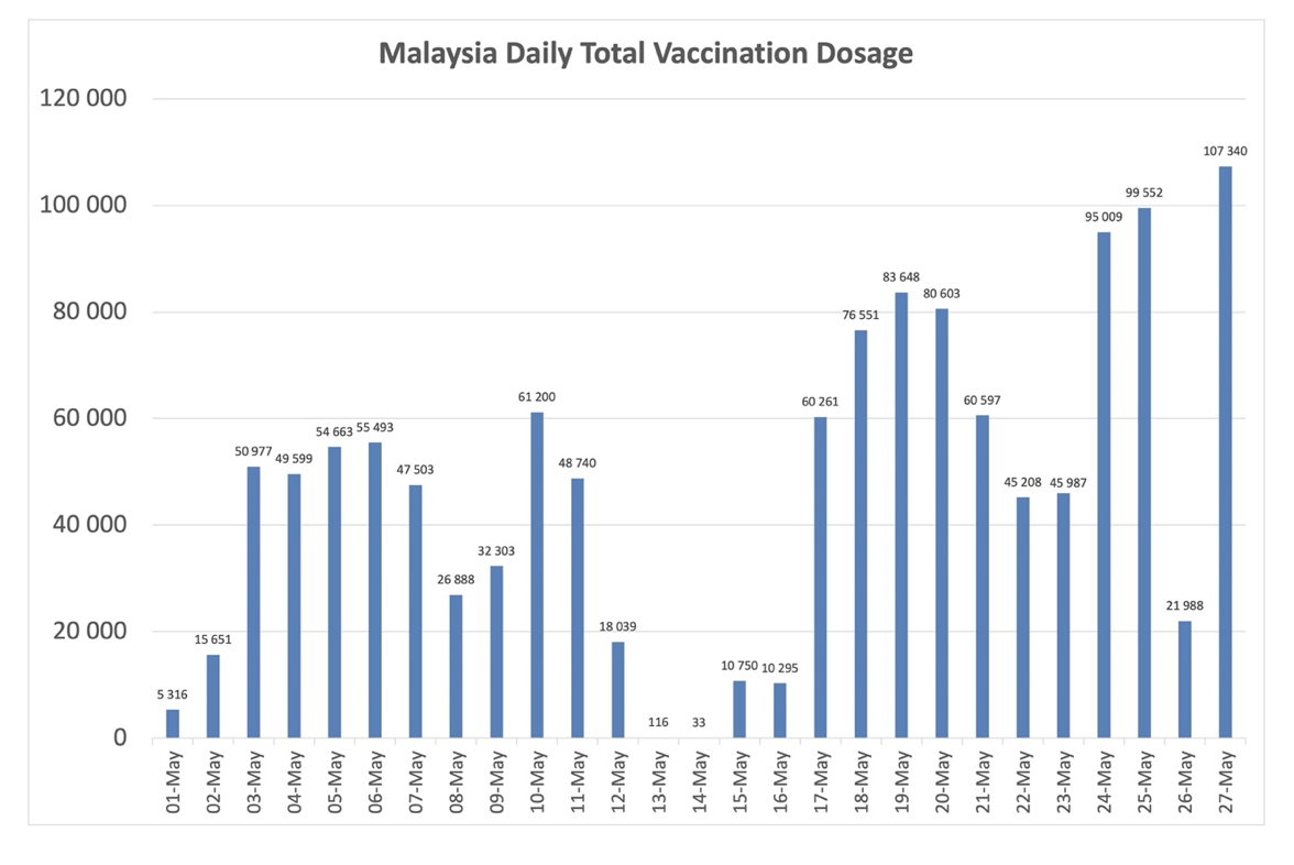 我也想知道每日15万剂接种率是最高每日接种率还是平均值?这是因为我发现,为了描绘比实际状况更美好的假象,政府倾向于在接种率较高的日子公布每日疫苗接种率,或使用“每日接种率达xxxx”的说辞,而不是给出七天的平均值。下图显示了大马五月份的每日疫苗接种率。请注意,部长总是选择在接种率较高的日子宣布每日疫苗接种率。