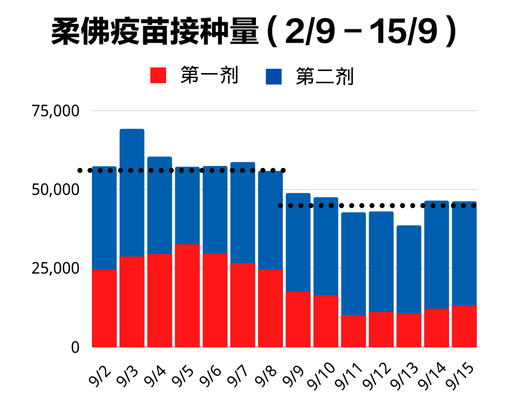 然而,最近每日疫苗接种量却有所降低,7天的平均疫苗接种量仅为44,717 剂,与柔佛州务大臣口中的每日7万剂目标相差甚远,更与上个星期的平均疫苗接种量55,814剂少了约1万剂。
