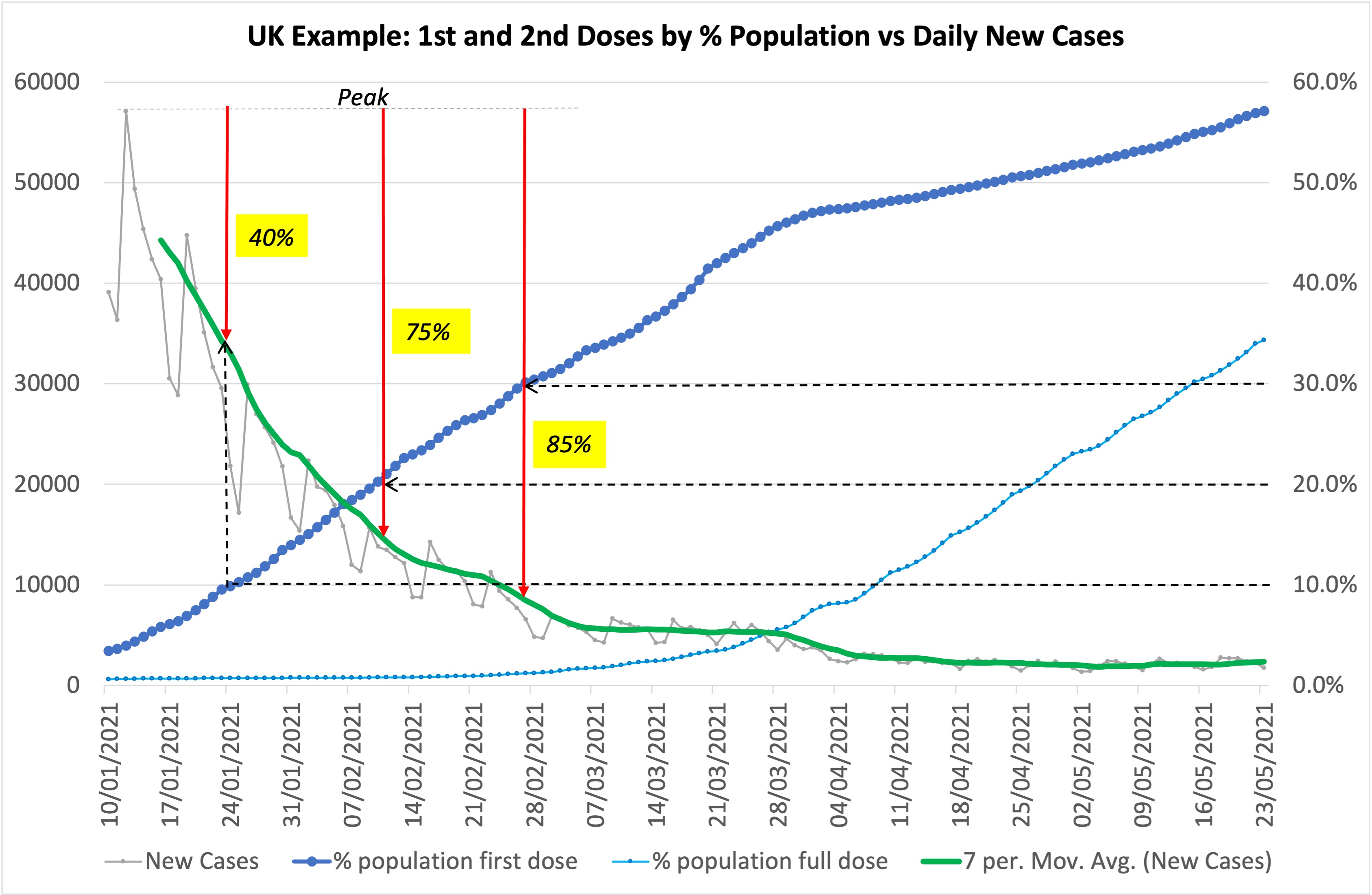 已接种第一剂疫苗的人口在前三个月呈线性增长,然后从第四个月开始呈缓慢增长趋势(第二张图片)。现在让我们看看最重要的是,当接种首剂疫苗的人口百分比从10%增加至20%和30%时,确诊病例也从高峰分别下降了40%,75%和85%。