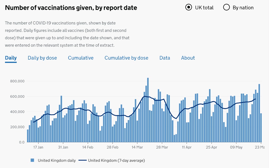 [英国在展开疫苗接种计划的第一个月内,接种率约每天15万剂,在第二个月达到每天40万剂,到第三个月中旬平均每天达到50万剂(最后一张图片)。至于我国的疫苗接种计划,由于供应有限,我国的疫苗接种率直到上周才开始提升。 ]