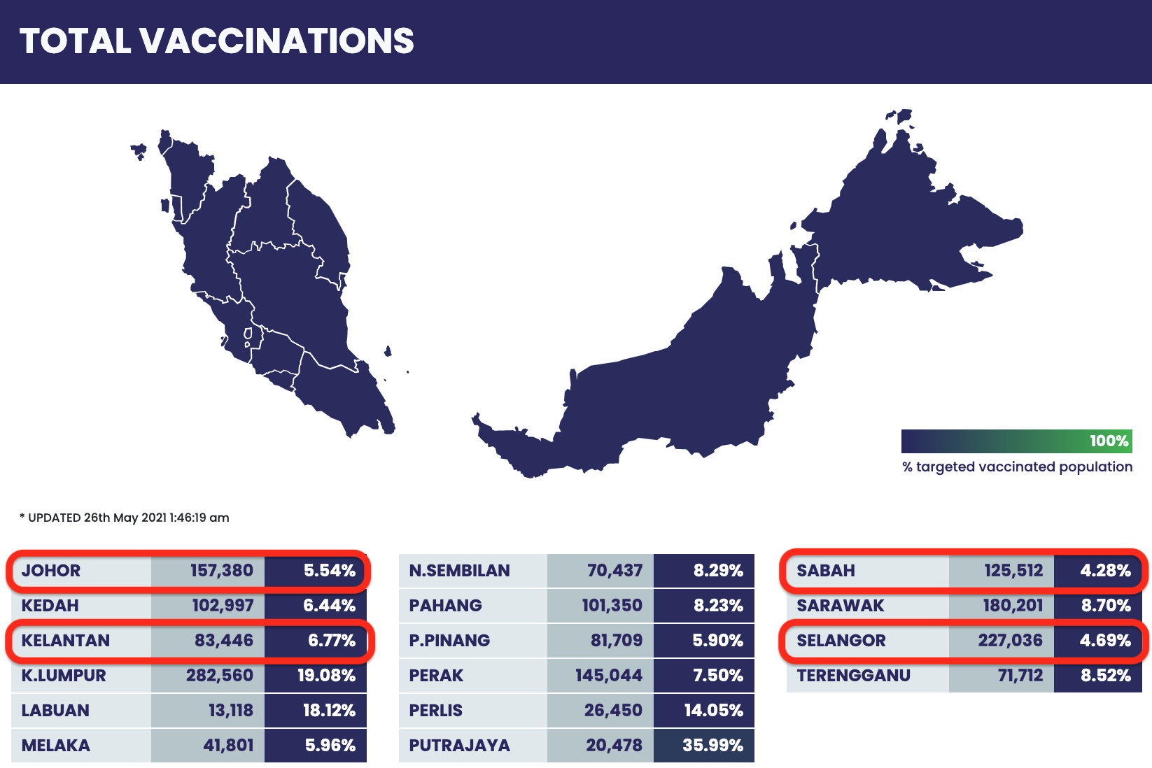 虽然如此,柔州却是疫苗接种率最低的州属之一。柔州5.54%的接种率,甚至比疫情没那么严重的吉兰丹、吉打、登嘉楼、彭亨和森美兰都来得低。