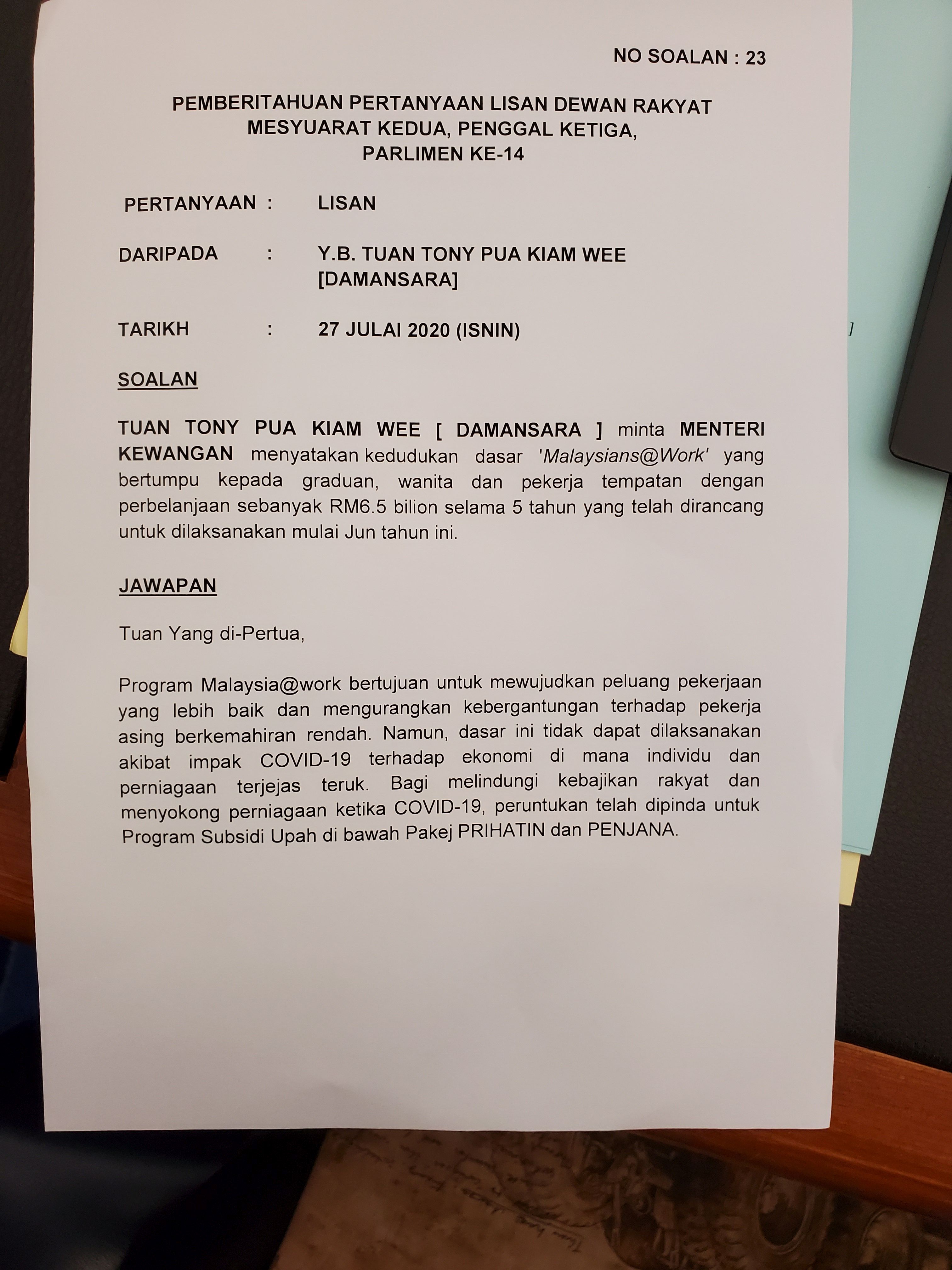 不幸的是,在新的国盟政府的领导下,财政部长在2020年7月27日回答我的国会提询时揭露,这项开创性的举措由于冠状病毒病(COVID-19)的危机而被终止。 (见附件)