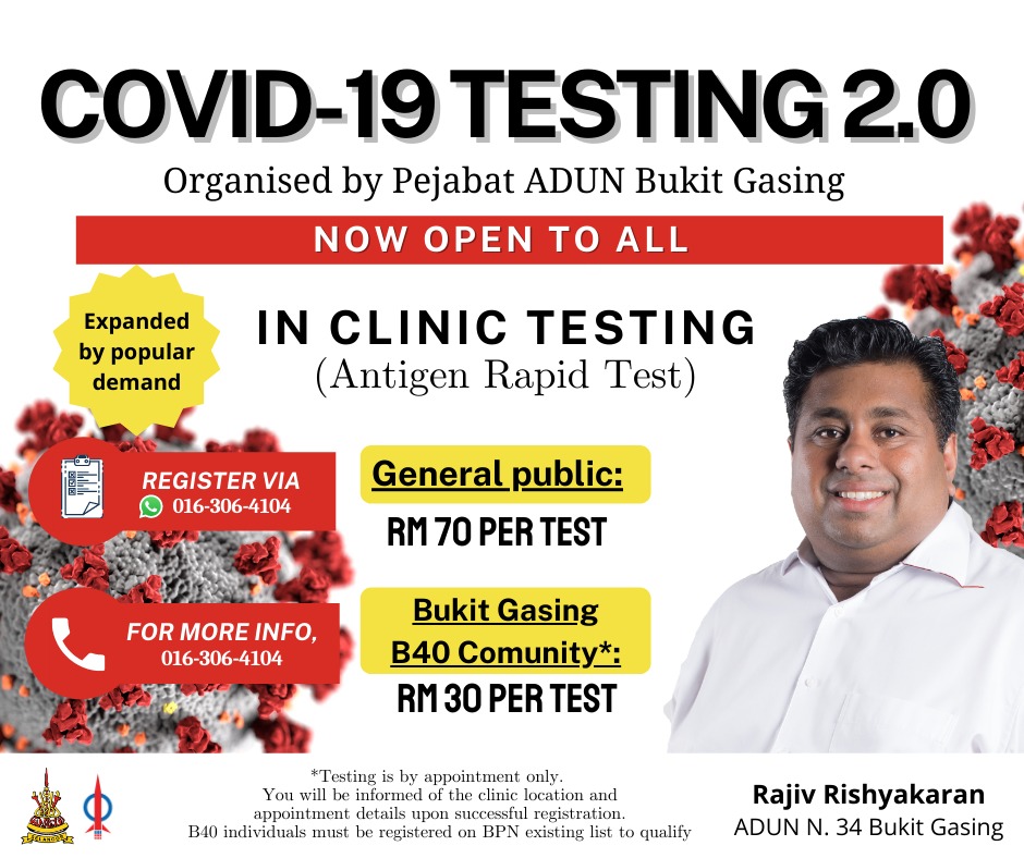 “To register for this Covid-19 test, share your details – name, address, IC number and contact number – via WhatsApp to 016 306 4104. Testing will be done by appointment only and details of your appointment will be shared upon successful registration. You may also call 016 306 4104 for enquiries,” shared Rajiv.
