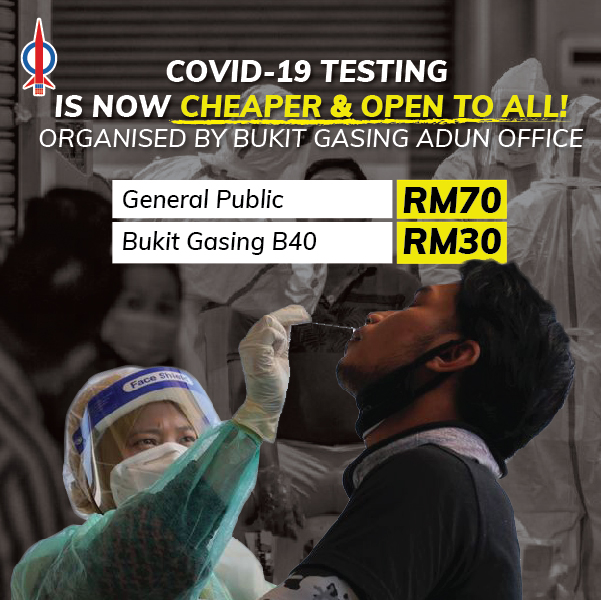 Rajiv Rishyakaran, ADUN Bukit Gasing, announced today that his office has organised COVID-19 testing (Rapid Test Kits-Antigen (RTK-AG) for the public at large, at a reduced-cost of RM70. Currently, the going rate for this test is between RM150 to RM180 at private healthcare facilities. The initiative which began exclusively for Bukit Gasing residents earlier this month has been expanded to include everyone in an effort to bring down the cost of Covid-19 testing, and make the test accessible to the public at large. In addition, B40 category Bukit Gasing residents who are registered under BPN are able to get themselves tested at a subsidised rate of RM30 per person.