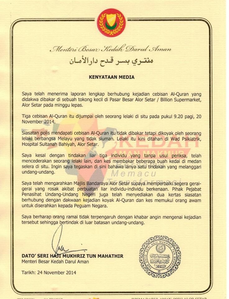 A statement by Kedah Menteri Besar Mukhriz Mahathir showed that he received reports following police investigations clarifying that the pages of Al Quran were torn and not burnt; and that this was done by a Malay man who is said to be mentally unstable.