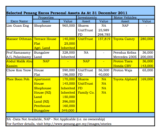Their allowances can be obtained from the Enakmen Anggota Pentadbiran dan Ahli Dewan Undangan Negeri(Saraan) 1980. The details of the all the excos assets can be viewed at www.penang.gov.my.