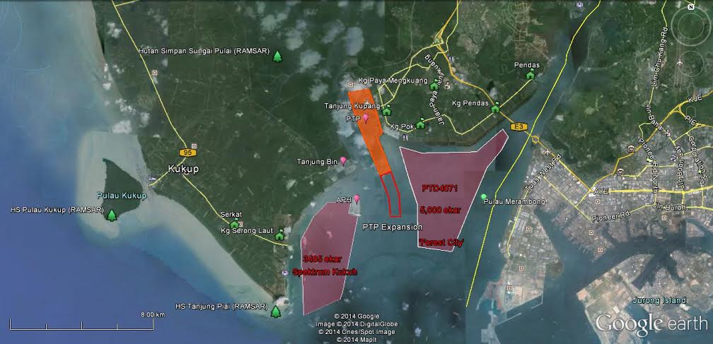 PTP is located west of Forest City. PTP is now undergoing expansion by building towards the east. (Please see attached map) According to official land search documents obtained from Johor Bahru Land Office, the government created a 5,000 acre land title on yet-to-be reclaimed coastal waters in the Johor Straits close to the Second Link. Such large reclamation work in a narrow straits will inevitably increase sediments and pose risk to the operation of PTP when the sea becomes shallower.