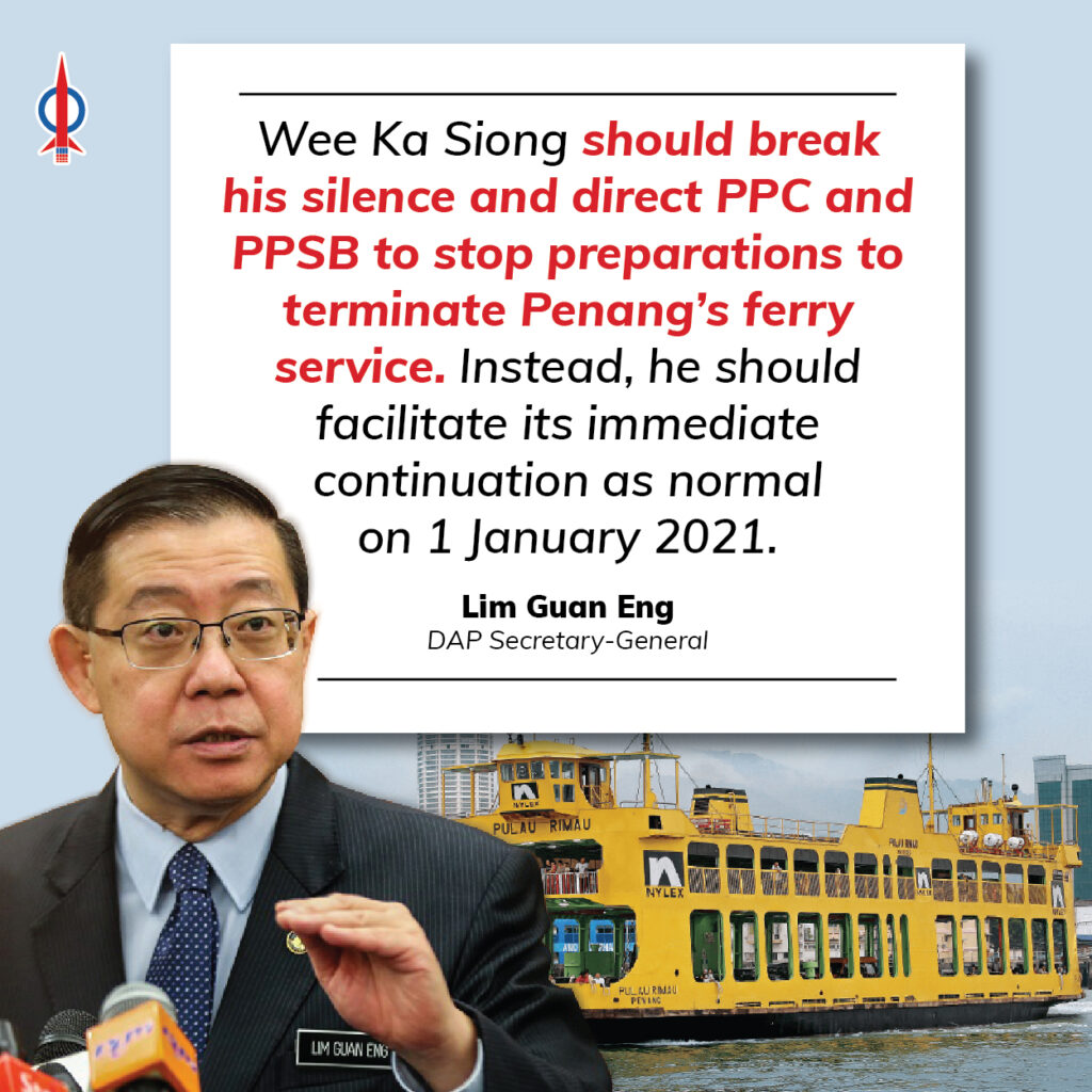 Transport Minister Wee Ka Siong should break his silence and direct both PPC and PPSB to stop their preparations to terminate the iconic Penang ferry service, but instead facilitate the immediate continuation of services as normal on 1 January 2021. Ever since Finance Minister Tengku Zafrul Tengku Abdul Aziz acceded to my request in Parliament on 17 December 2020 to continue the 126 year old ferry service, there is an unholy silence from Wee, PPC, and PPSB as to whether the service will continue as instructed.