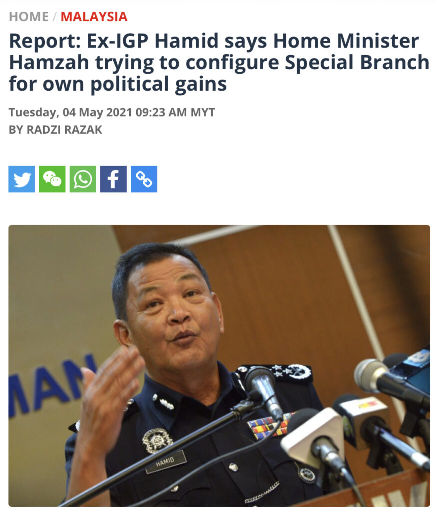 Hamid was quoted as saying that it involved Hamzah’s attempt to install his favoured candidate to lead the Special Branch after the police intelligence unit snubbed the minister’s request to conduct political operations.