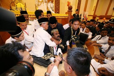 The legislative faceoff finally culminated in a showdown more akin to a hooligan brawl, dragging Malaysian democratic image to a new low. The speaker of the State Legislative Assembly was shouted at and forcibly carried away from his seat, and in his place a new speaker installed ignominiously.