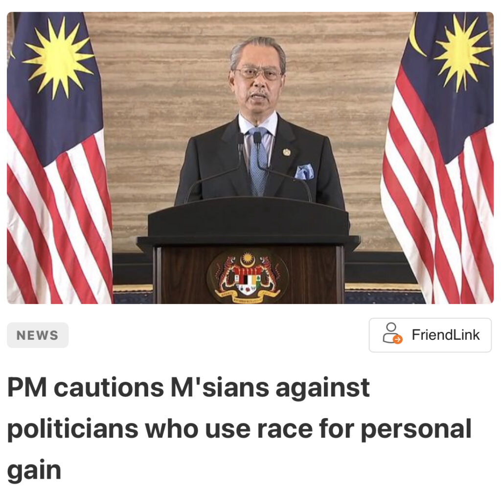 I laud the Prime Minister Muhyiddin Yassin’s word of caution to all Malaysians not to allow politicians who use racial cards to gain political mileage.