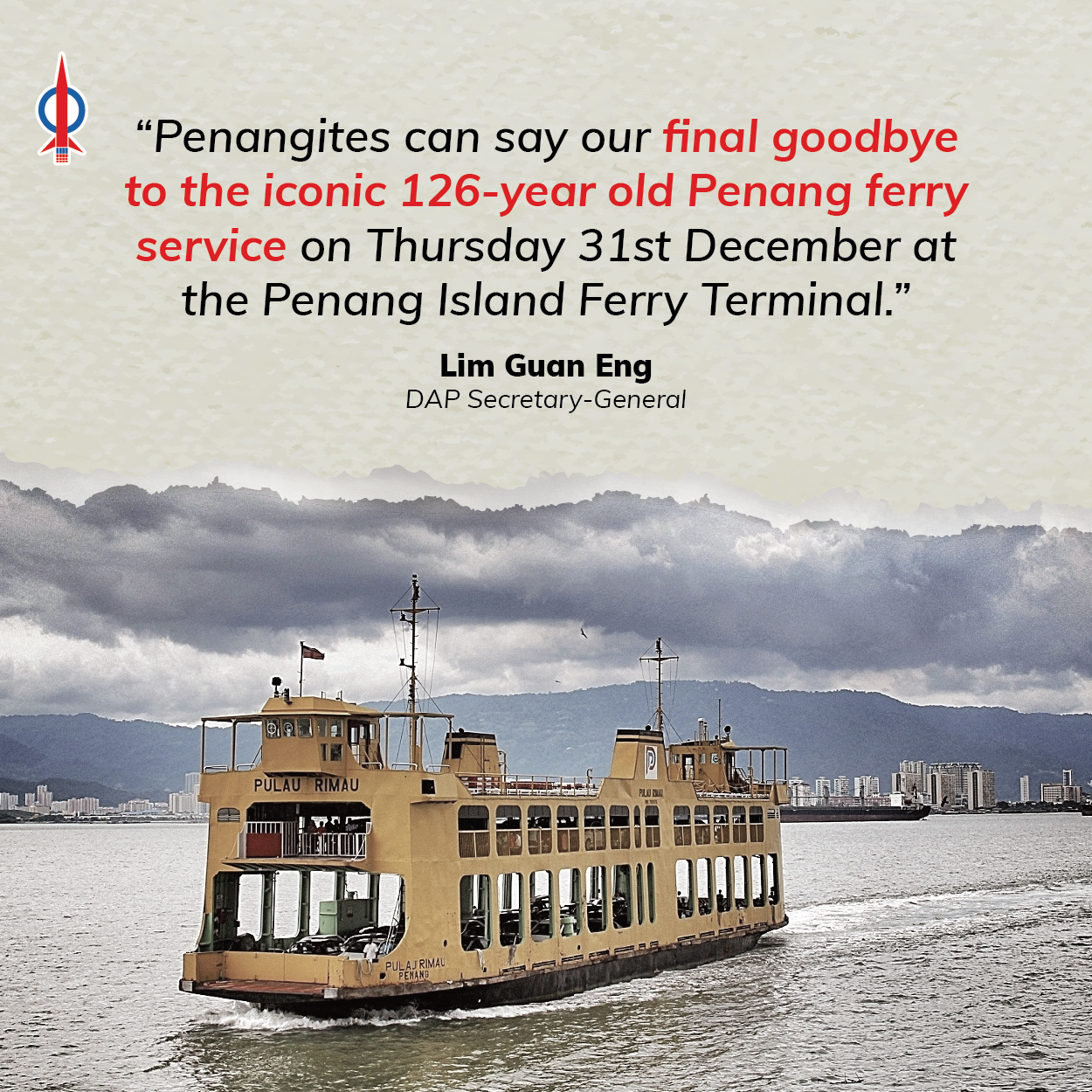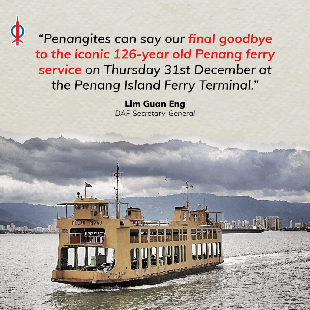 This is unlike the Transport Ministry and Penang Port Commission (PPC) under the new PN federal government, which decided to terminate the ferry service outright on 31 December 2020 without any sentiment for its unique historic and heritage value. Let us say our final goodbye on Thursday. Just as we will not forget our iconic ferry service, Penangites will never forgive the culprits responsible for terminating the iconic ferries.
